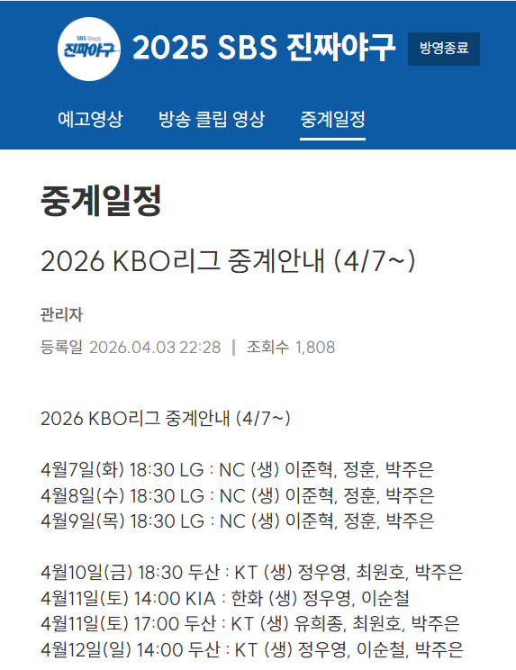 야구중계 해설위원 확인은 해당 방송사 홈페이지에서 가능합니다